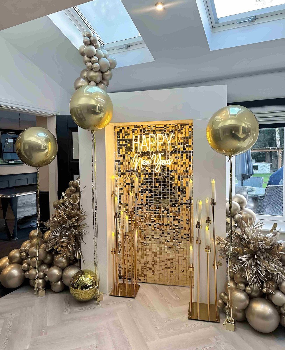 تنسيق فاخر لرأس السنة بجدار لامع من السكيّن الذهبي، ولافتة مضيئة “Happy New Year”، مع شموع طويلة بتصميم ذهبي وبالونات معدنية أنيقة. تصميم يعكس الفخامة ويمنح الاحتفال بريقاً مميزاً.