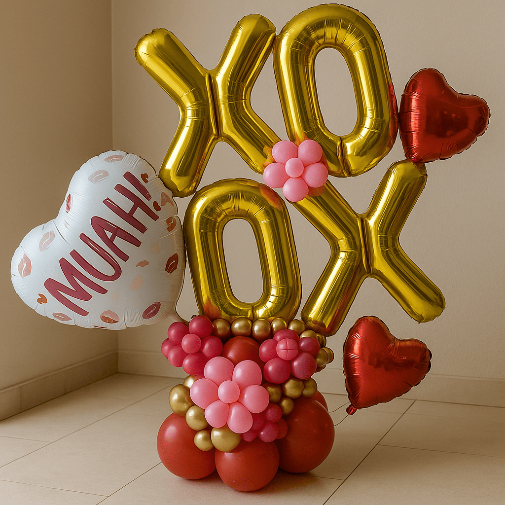 عرض بالونات رومانسي بحروف XO الذهبية مع بالونات فويل قلوب وزينة بالونات وردية. مناسب لذكرى الزواج، الخطوبة والمفاجآت الخاصة. ديكور يضيف لمسة حب وأناقة للاحتفال.