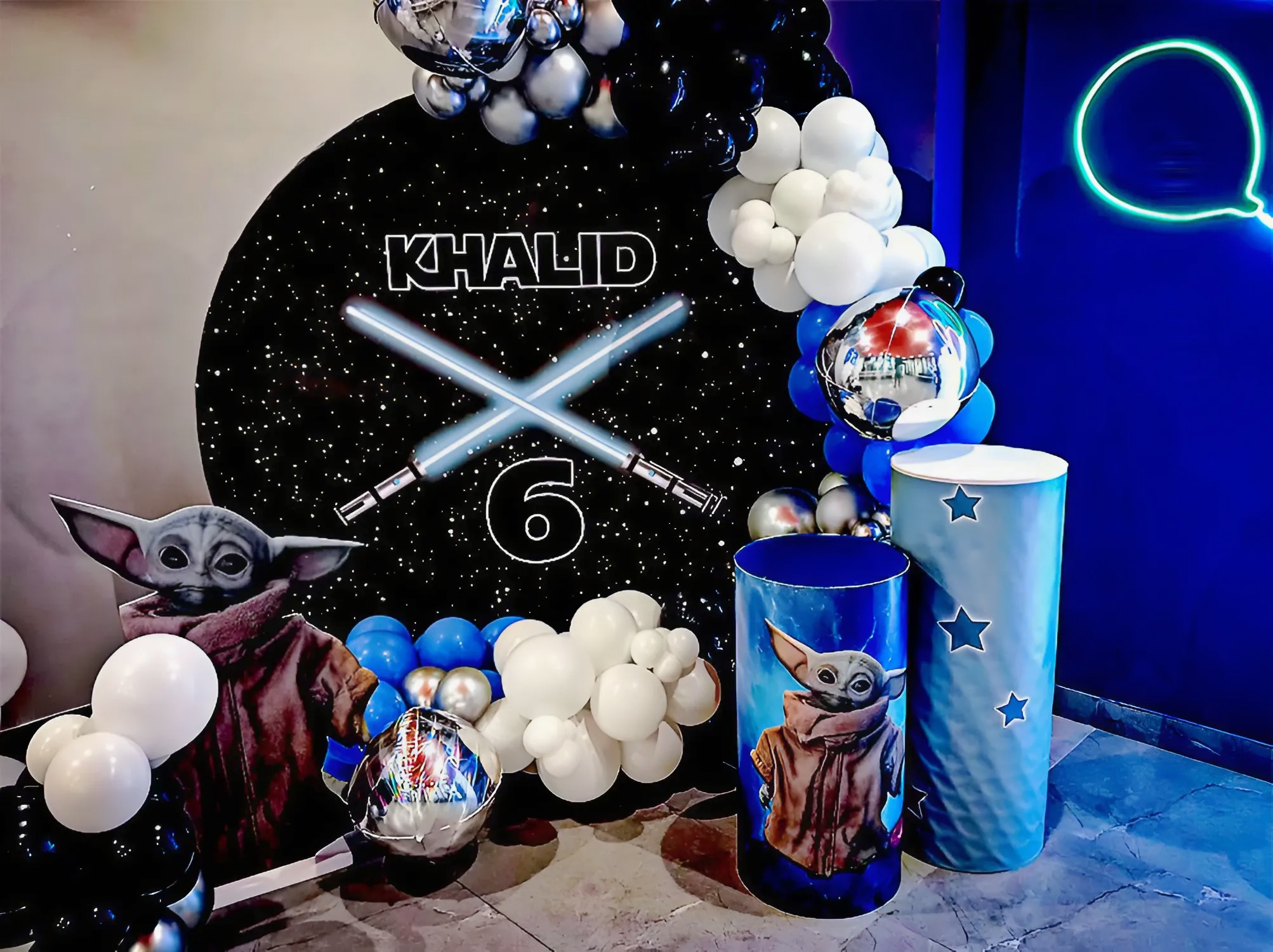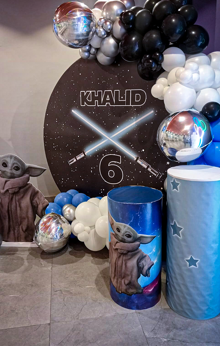 تنسيق حفلة عيد ميلاد مستوحى من حرب النجوم بتصميم فضائي مميز مع يودا والبالونات الجميلة والسيوف المضيئة. مثالي لحفلات الأطفال وإضافة أجواء ممتعة لأي احتفال بعيد ميلاد مع ديكور جميل يجعل المناسبة مميزة ولا تُنسى.