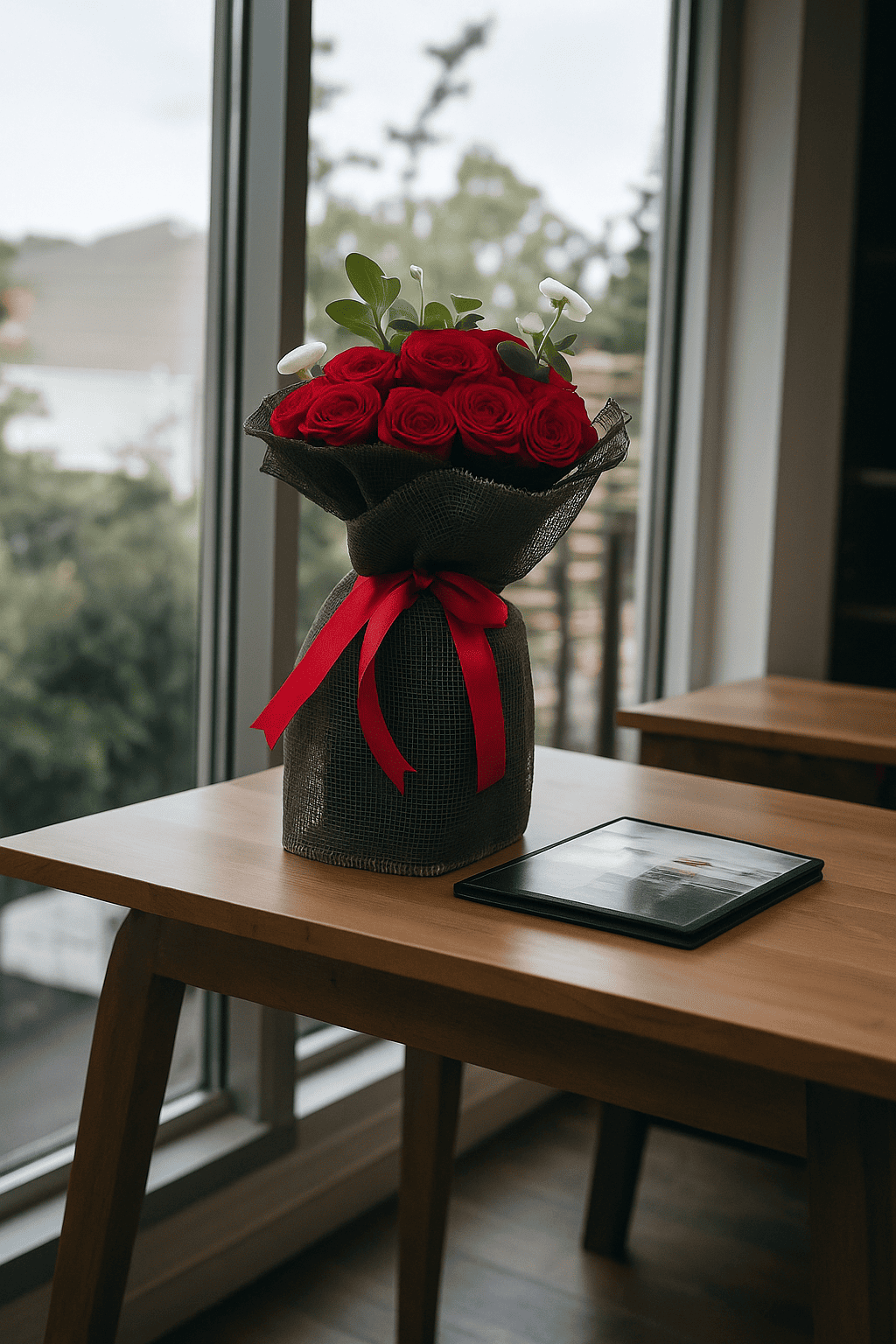 باقة ورد أحمر فاخرة بلمسة ريفية، ملفوفة بخيش أنيق ومزيّنة بشريط أحمر، لتقدم حضورًا دافئًا وراقيًا. هدية مميزة للمناسبات والأعياد واللحظات الخاصة