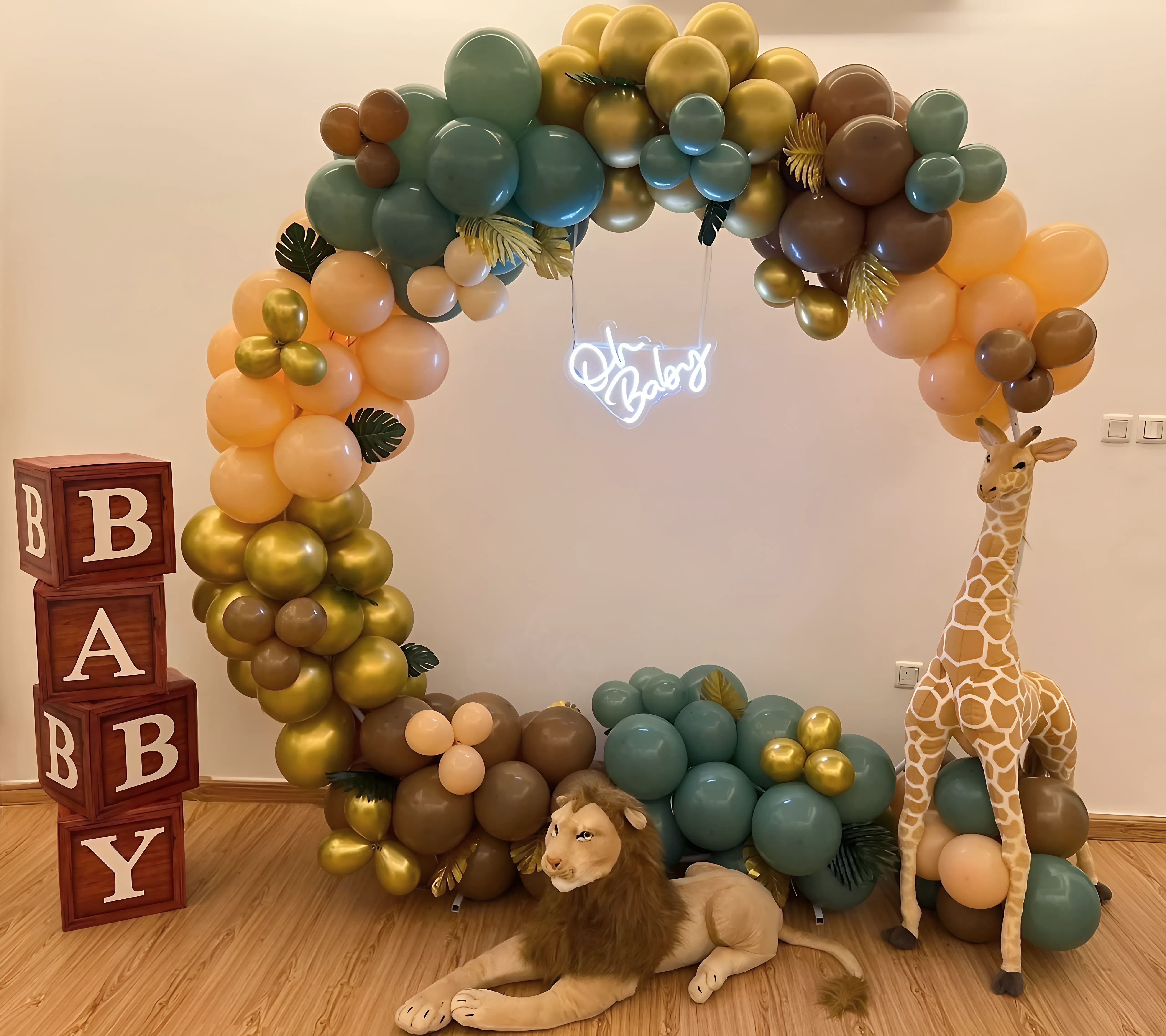 ثيم السفاري بيبي يعطي أجواء فخمة ومليانة حياة. بلونات بألوان ترابية من الذهبي والأخضر والبيج مع مجسمات الأسد والزرافة تضيف لمسة مرحة ومميزة. مثالي لحفلات استقبال المواليد والبيبي شاور بأجواء طبيعية أنيقة.ثيم السفاري بيبي يعطي أجواء فخمة ومليانة حياة. بلونات بألوان ترابية من الذهبي والأخضر والبيج مع مجسمات الأسد والزرافة تضيف لمسة مرحة ومميزة. مثالي لحفلات استقبال المواليد والبيبي شاور بأجواء طبيعية أنيقة.