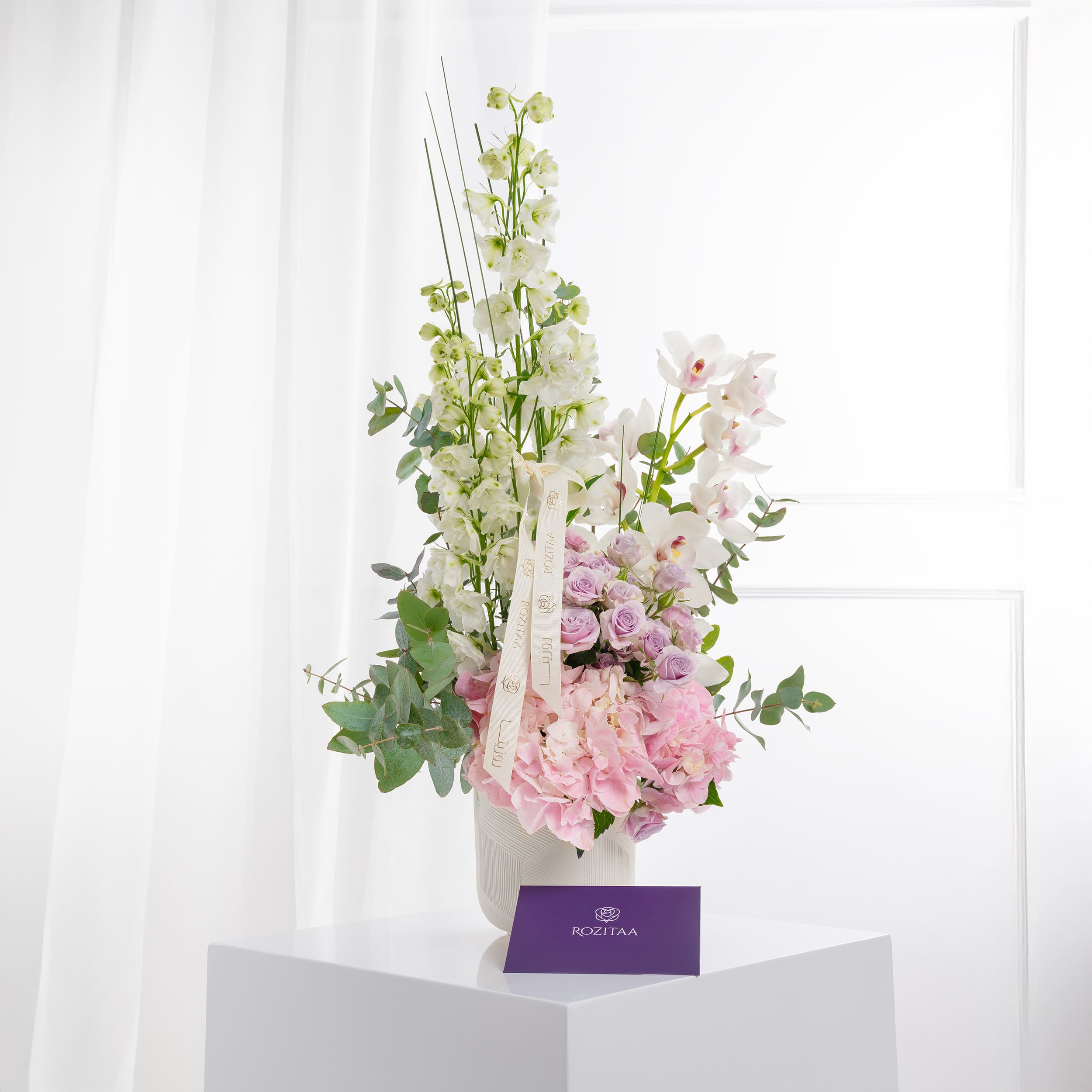 باقة روزيتا الملكية لوحة مترفة من الجمال، يتوسطها سمب أبيض يرمز للنقاء ويهمس بالكمال والرقي