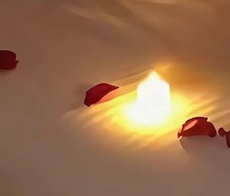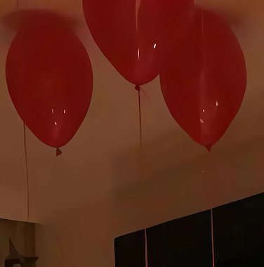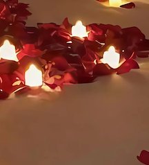 غرفة نوم مجهزة بديكور رومانسي مع بالونات حمراء وورود معلّقة وبتلات ورد وشموع LED حول السرير. مناسب لعيد الزواج، شهر العسل والمفاجآت الخاصة. أجواء دافئة وفخمة تضمن لحظات لا تُنسى.