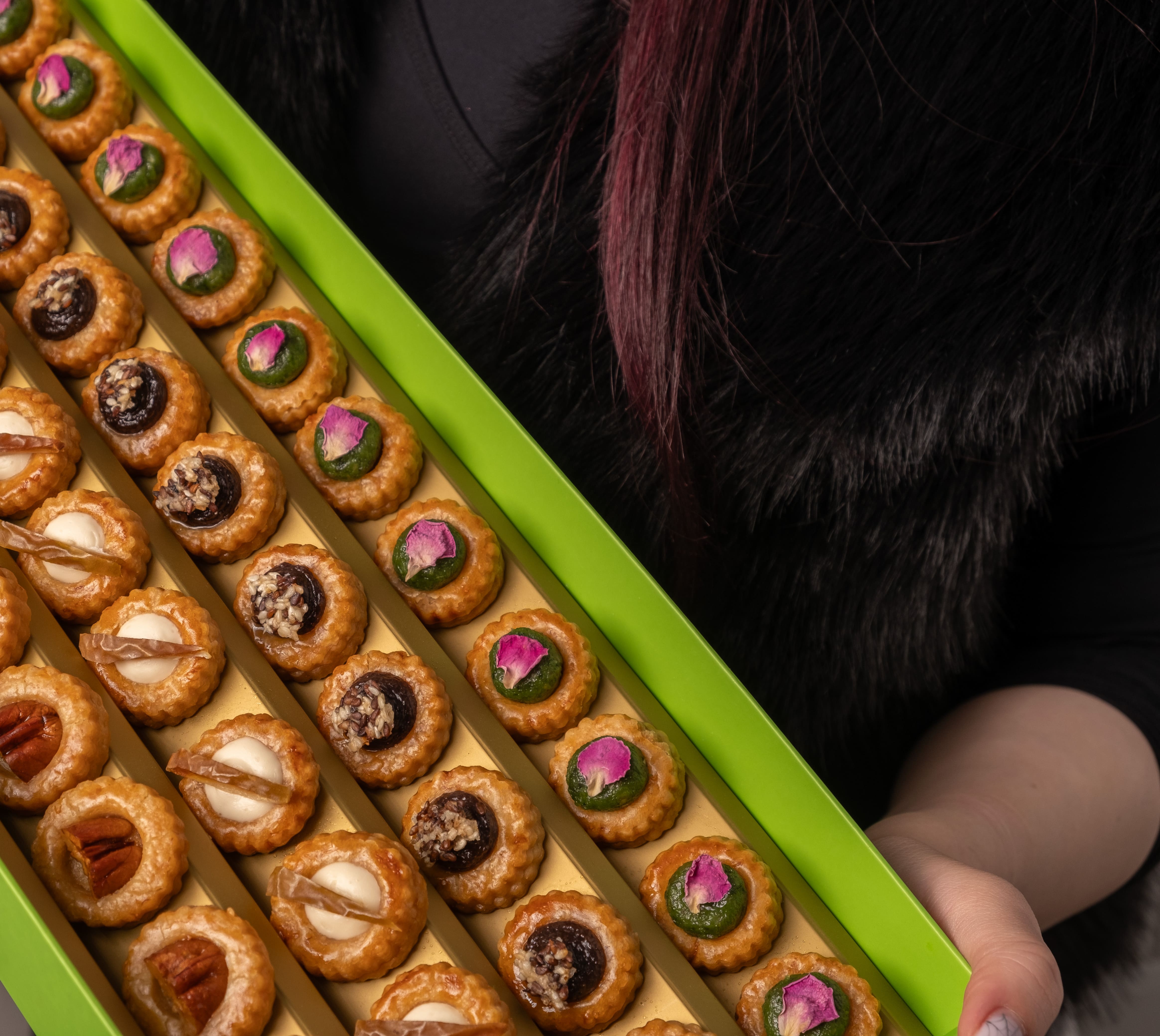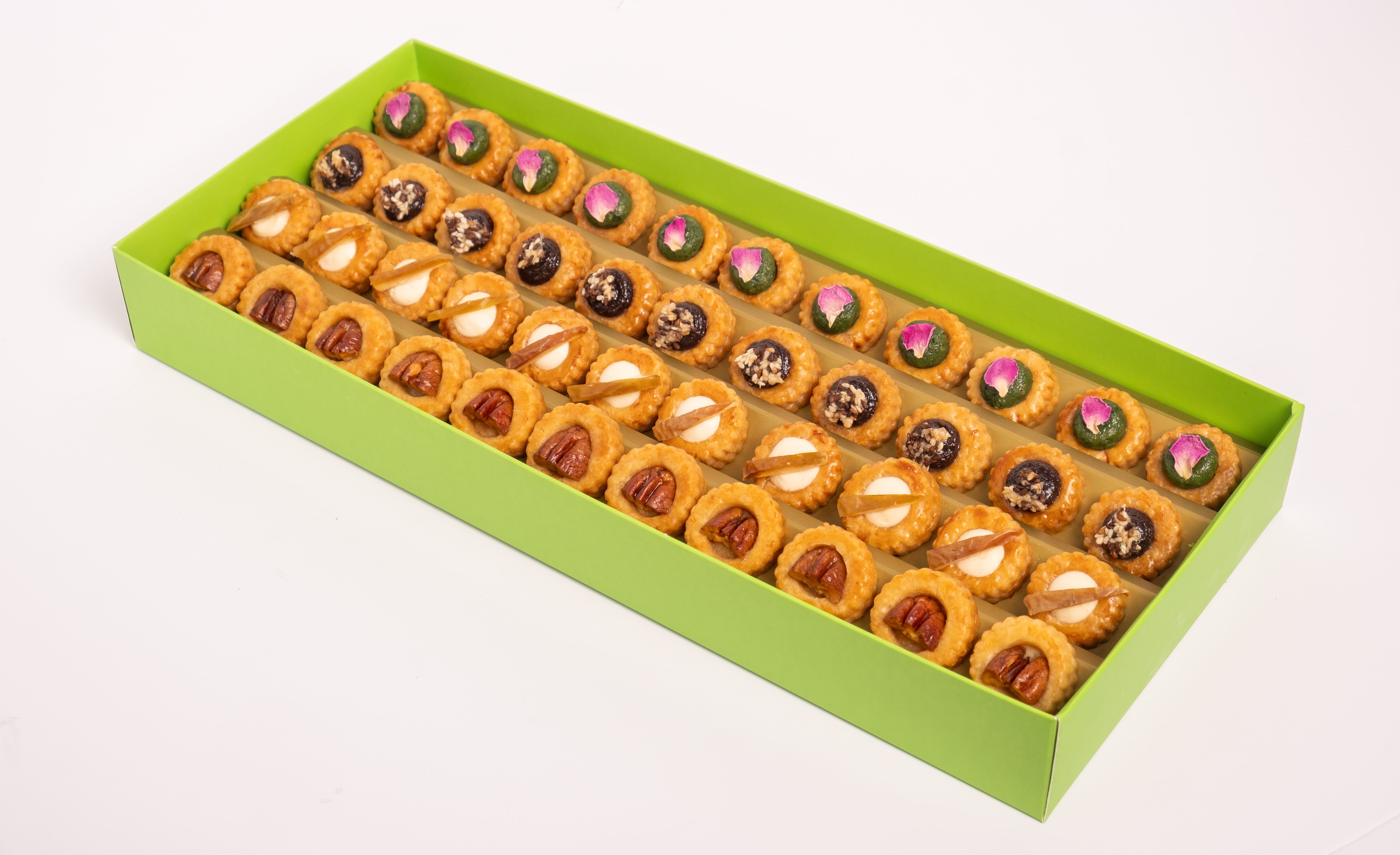 بوكس سواني اختيار نوع واحد 1- البيكان : قطعة من عجينة هشة مُحلاة بحشوة البيكان. 2- الفستق : قطعة من عجينة هشة مُحلاة بحشوة الفستق. 3- كاسترد الطحينة : قطعة من عجينة هشة مُحلاة بحشوة الكاسترد مع الطحينة السوداء. 4- المفروكة : قطعة من عجينة هشة مُحلاة بحشوة المفروكة