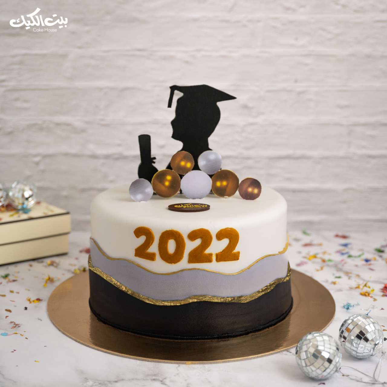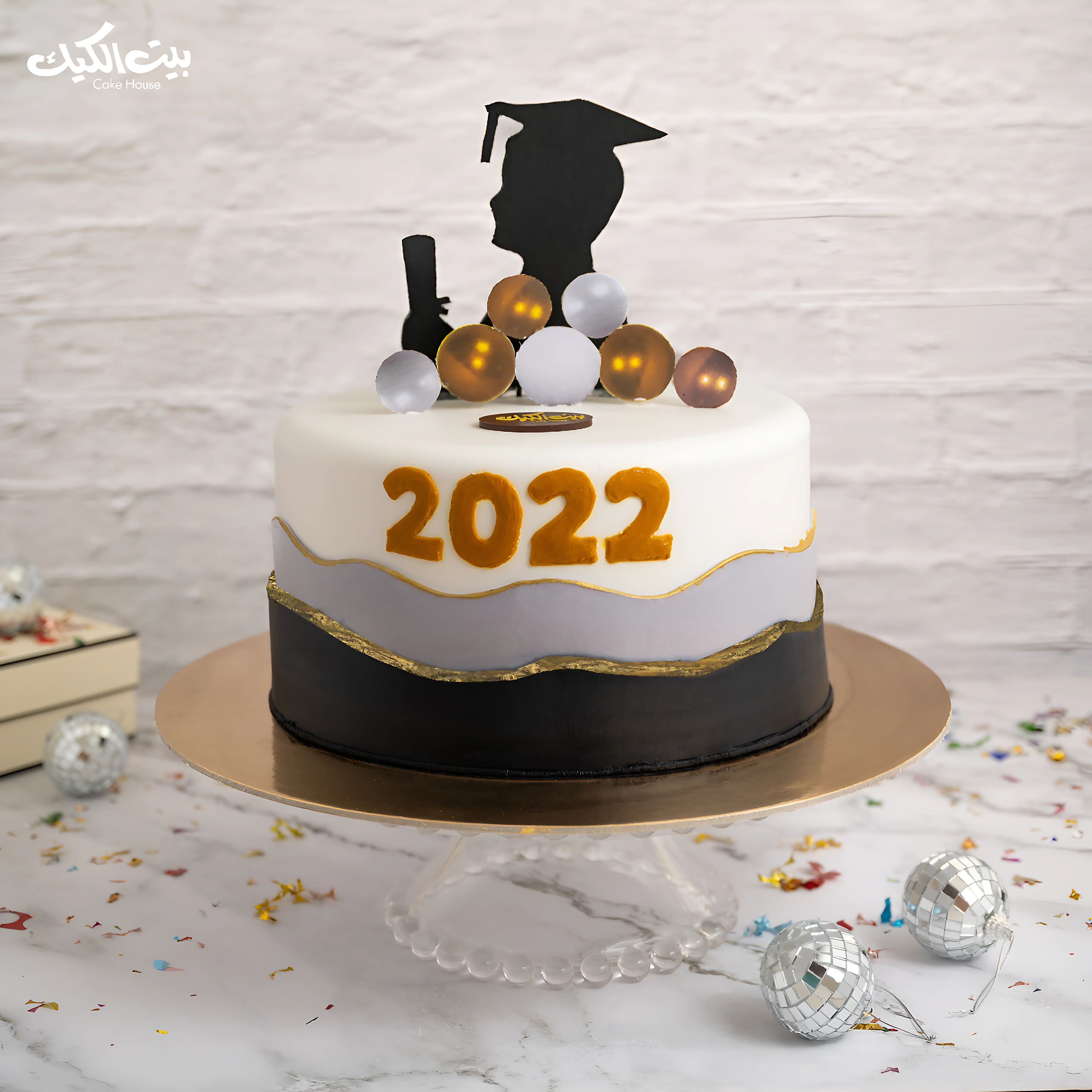 كيكة دائرية بطبقات باللونين الأسود والرمادي، مزينة برقاقات ذهبية وكرات لامعة، مع مجسم ظلي لخريج يحمل شهادة. "سنة التخرج" يزين الواجهة بلون ذهبي بارز تكفي لعدد ١٥ شخص