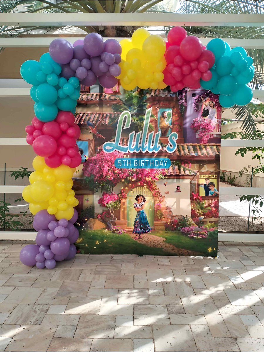 تزيين حفلة عيد ميلاد للأطفال مستوحى من إنكانتو مع بالونات ملونة وديكور مبهج. تنسيق مثالي لحفلة عيد ميلاد ممتعة واحتفال مميز يضيف أجواء سحرية وجميلة للاحتفال.